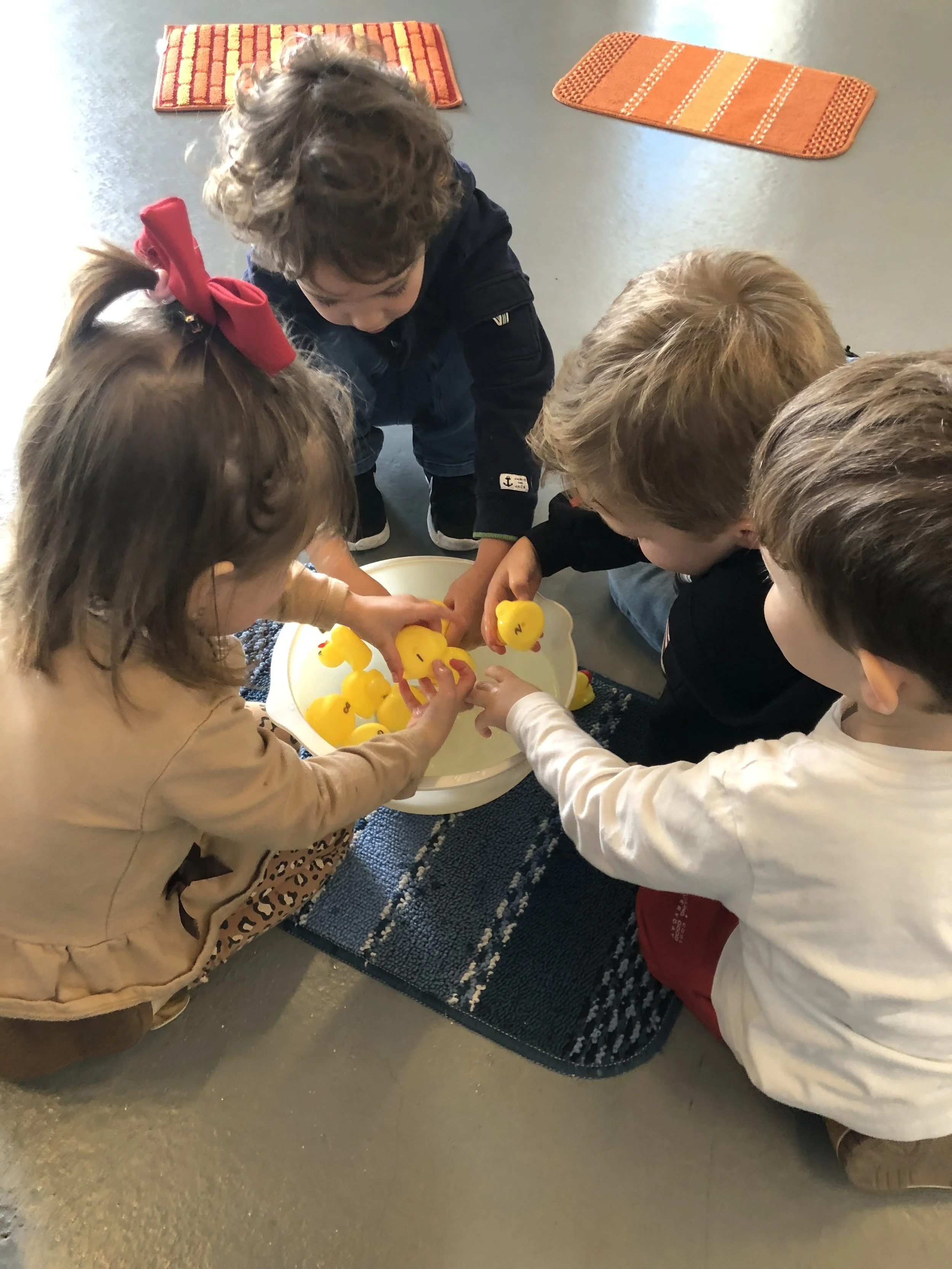 Students practice storytelling parts of “Goldilocks and the Three Bears” while pretending to make three different bowls of porridge.